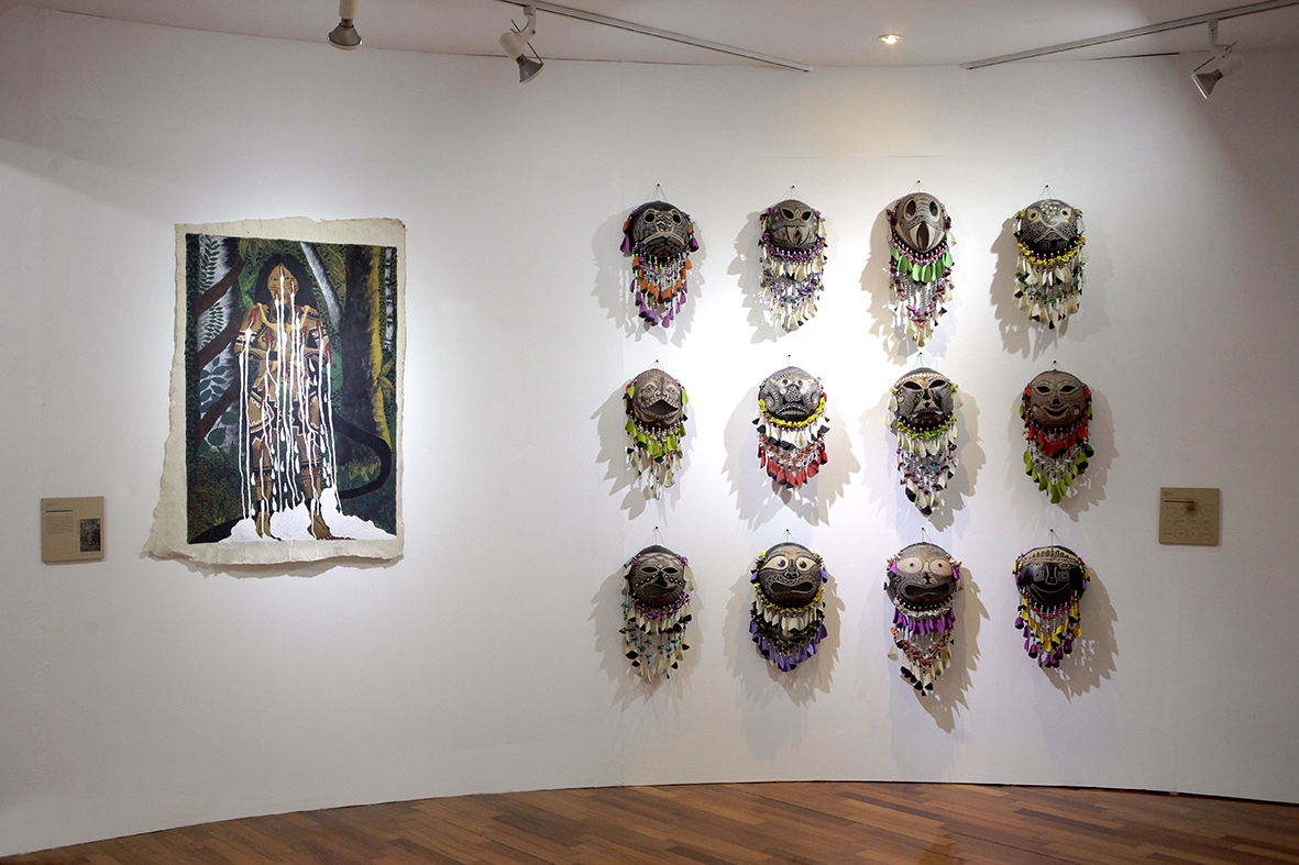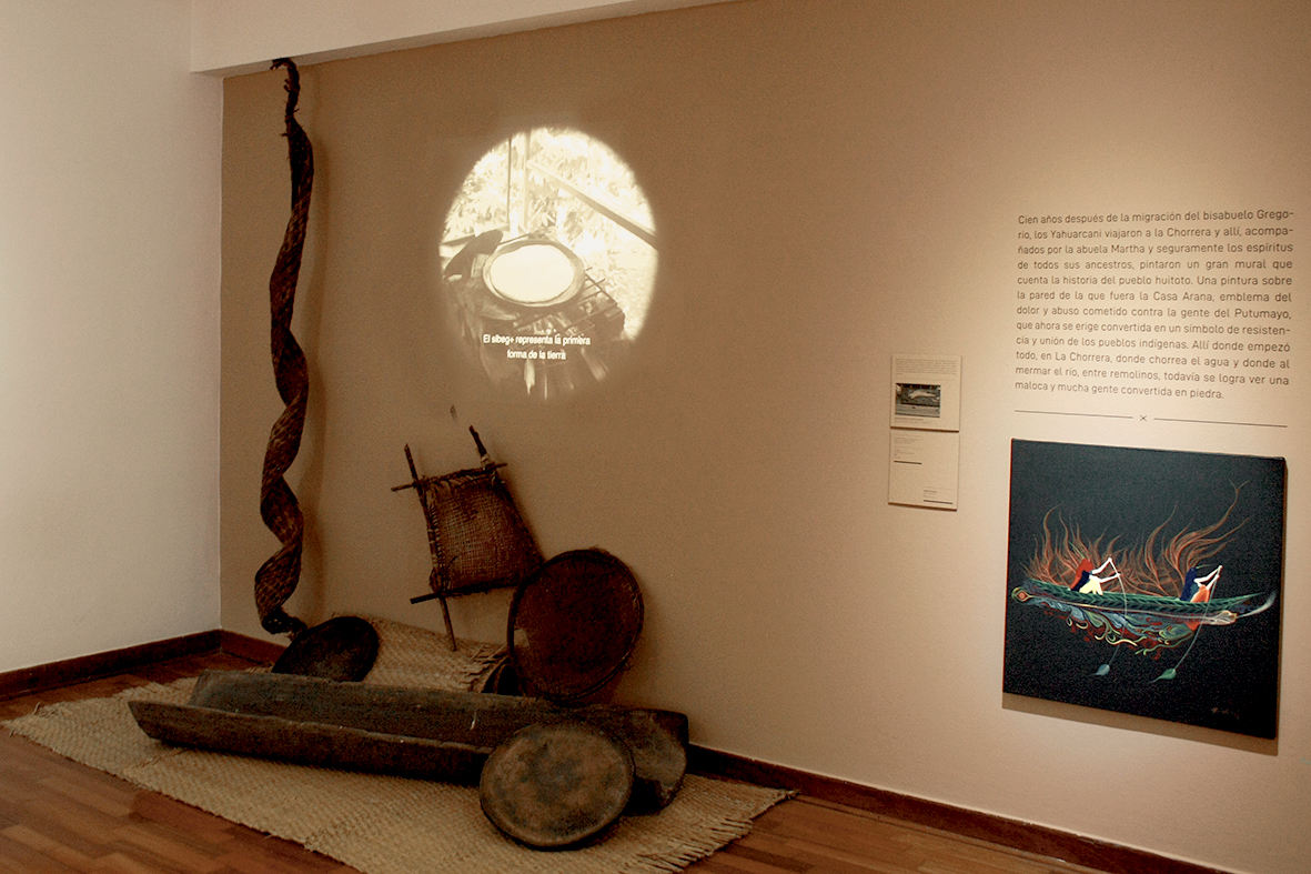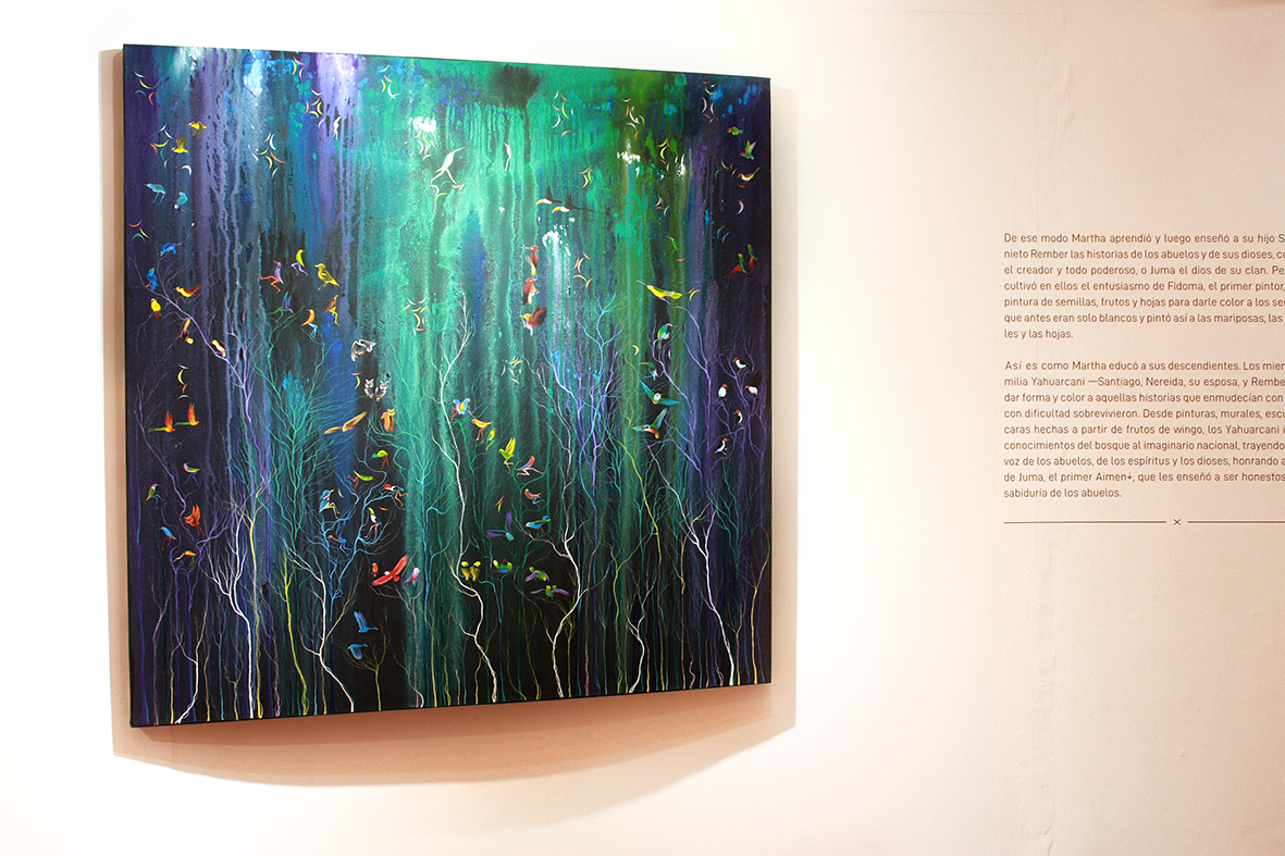 Para ellos, la naturaleza amazónica es la fuente inagotable de recursos para su producción artística. Desde elementos tan comunes de la zona como la topa, madera que sirve para la construcción de balsas, pero que, por su suavidad, se convierte en el soporte ideal para los tallados de Santiago Yahuarcani, muchos de los cuales, cual tótems, simbolizan a poderosos dioses, madres y dueños de la voluntad de la naturaleza. Por otro lado, su esposa Nereida López, elabora máscaras con sutiles labrados sobre la cáscara seca del wingo, un gran fruto que la artista convierte en rostros, decorados de semillas y escamas de paiche y arawana, de una naturaleza amigable y traviesa, en la que conviven animales y figuras que cuentan mitos sobre el origen de fenómenos y elementos del bosque y los ríos. Por su parte, Rember Yahuarcani, hijo de ambos quien ha exhibido su obra en diferentes países y a través de su pintura, recupera una memoria que plantea el rescate de la identidad originaria del clan Aimen+, pero que explora una libertad técnica que no se condiciona al carácter tradicional al que suele suscribirse el arte indígena.